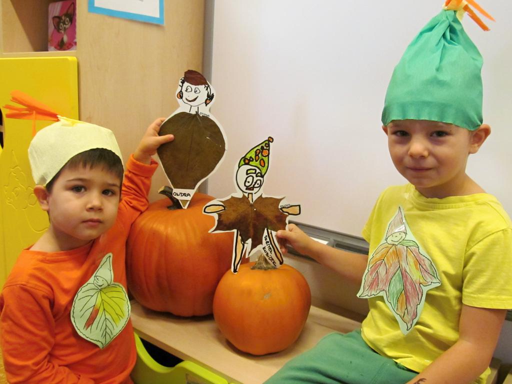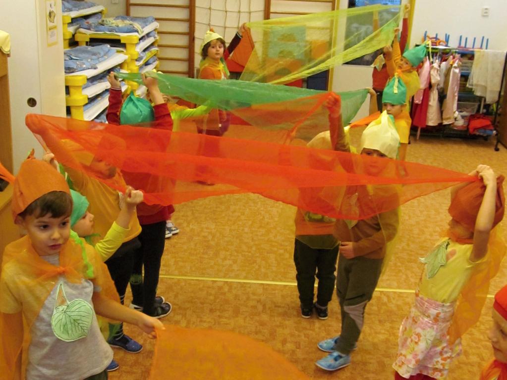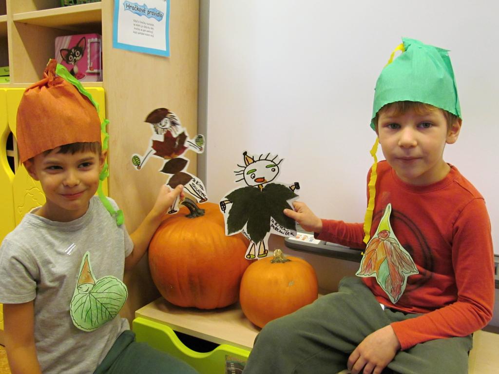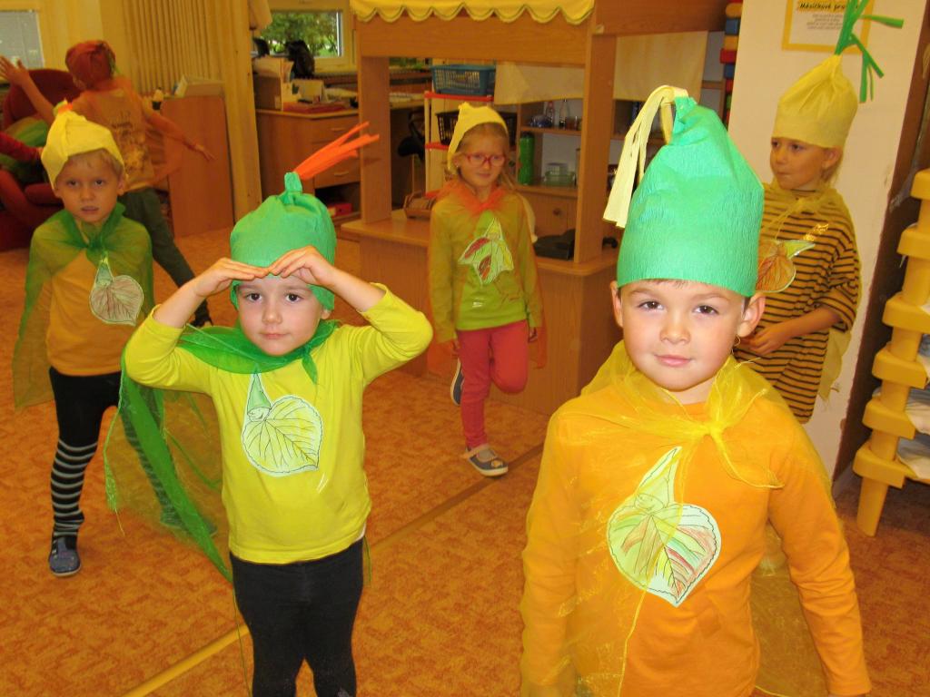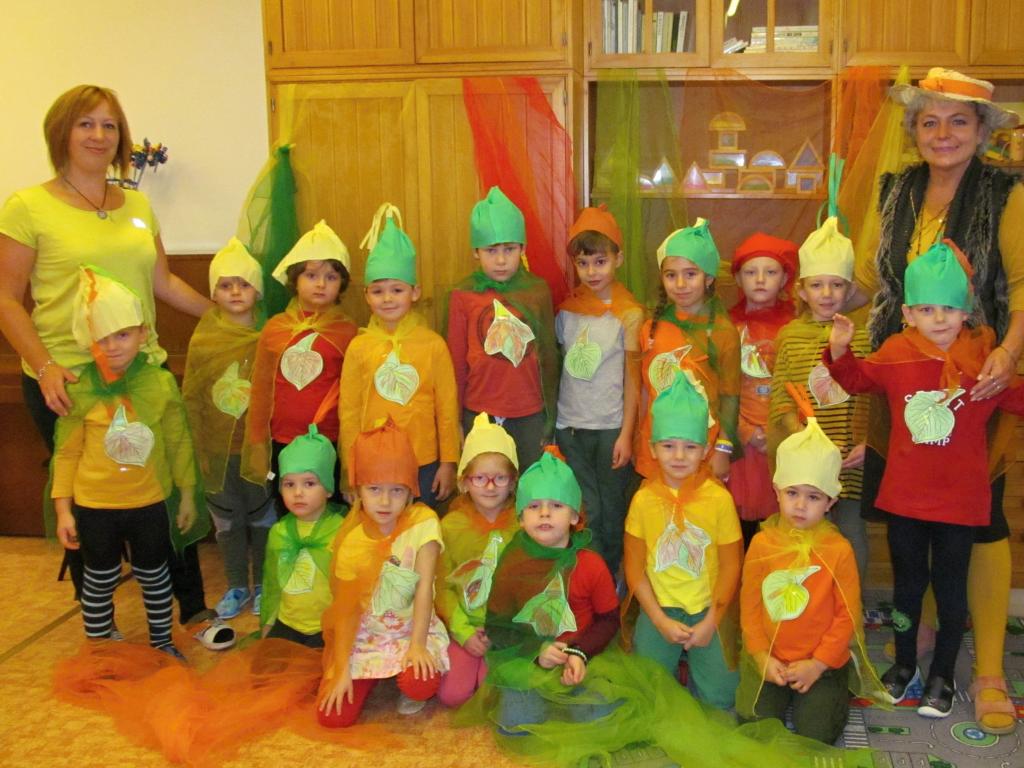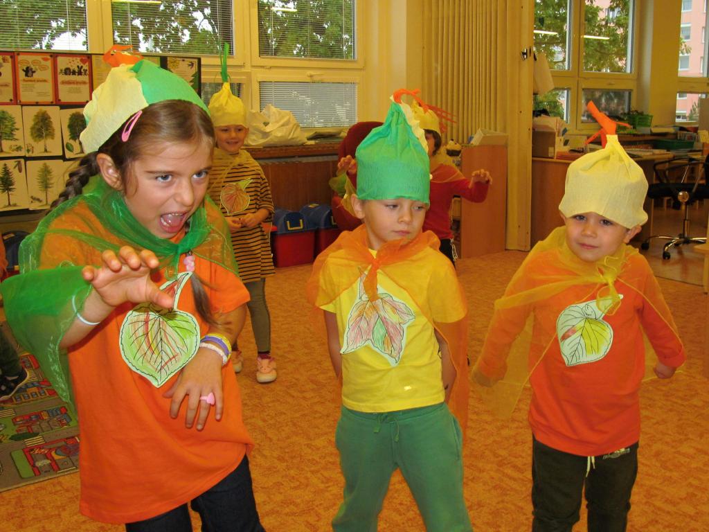 Na louku plnou skřítků podzimníčků se proměnila třída A - horní. Rodiče zařídili trička v podzimních barvách, starší děti si vymyslely jméno pro skřítka a vytvořily tuto postavičku z listů. Následovalo tvoření čepiček a podzimní zpívání. Potom předškoláčci plnili skřítkovy úkoly a vyřádili se na podzimní diskotéce.