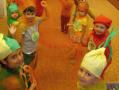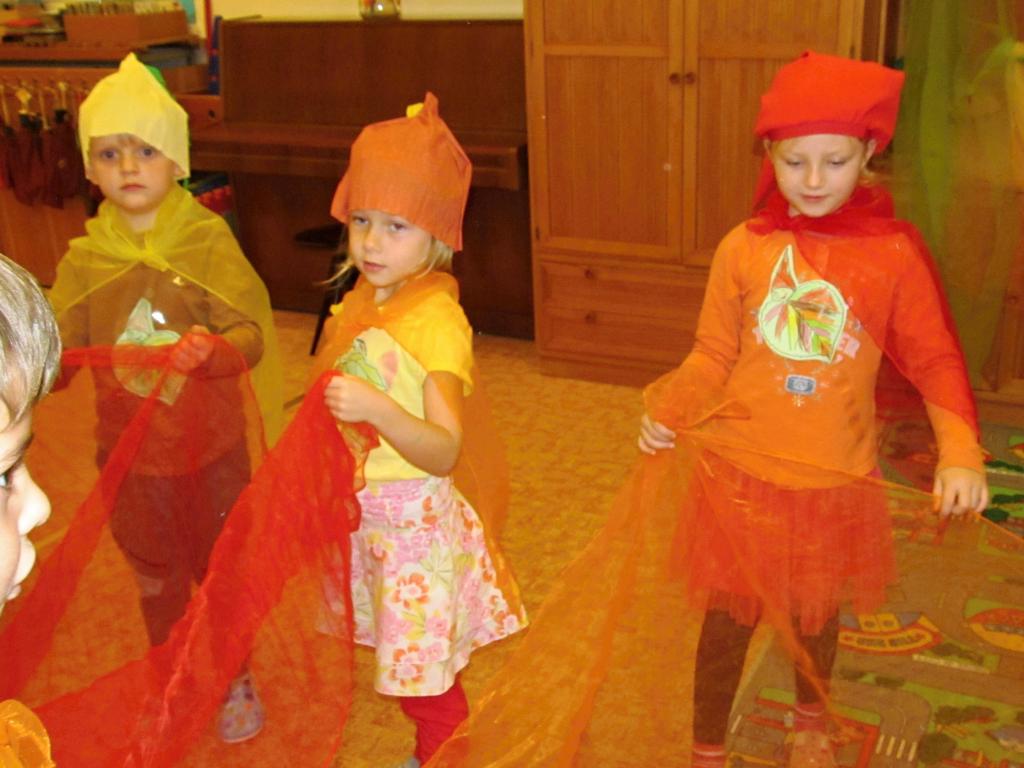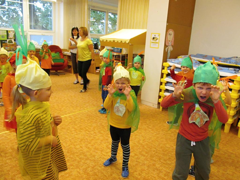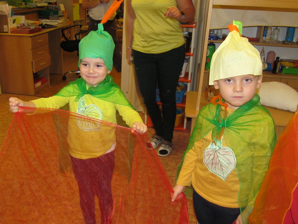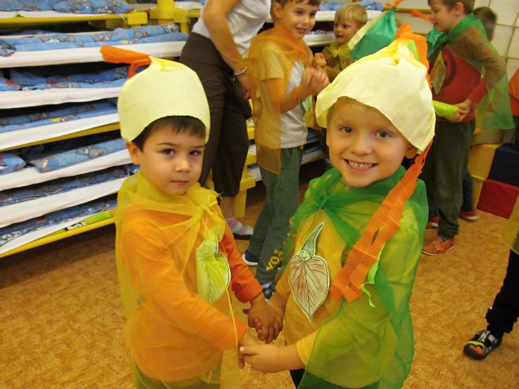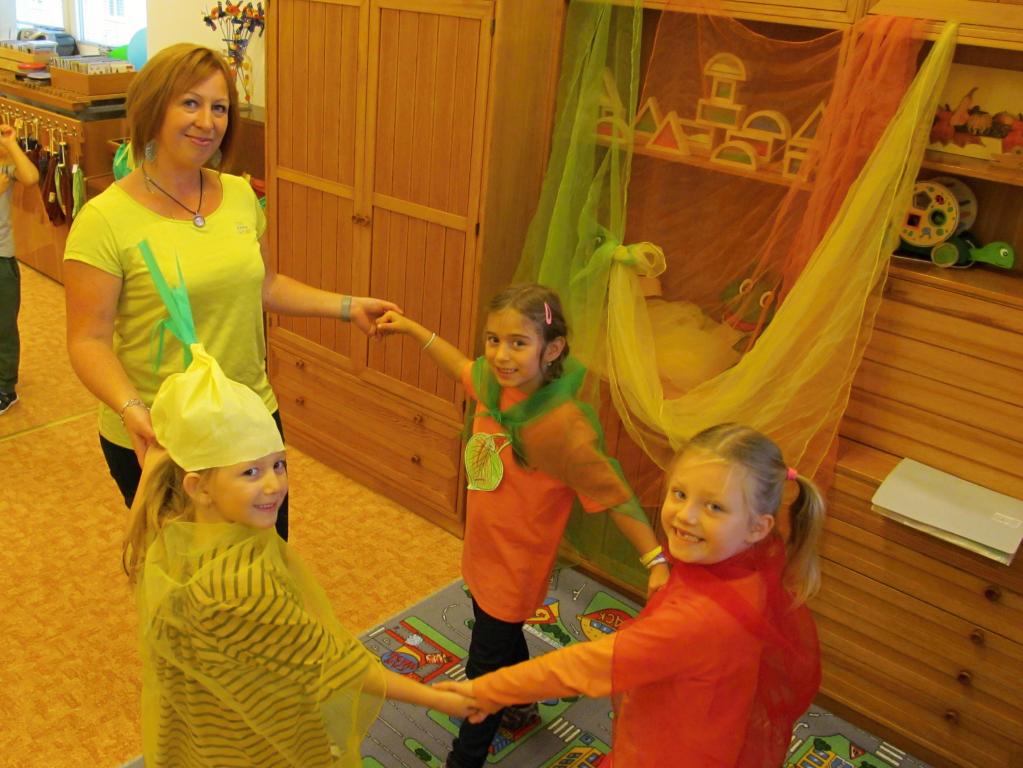 Na louku plnou skřítků podzimníčků se proměnila třída A - horní. Rodiče zařídili trička v podzimních barvách, starší děti si vymyslely jméno pro skřítka a vytvořily tuto postavičku z listů. Následovalo tvoření čepiček a podzimní zpívání. Potom předškoláčci plnili skřítkovy úkoly a vyřádili se na podzimní diskotéce.